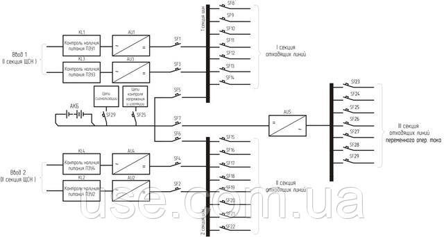 Напруга змінного струму, від щита власних потреб, надходить через клемні затискачі Х2 на введення зарядних модулів AU1 ÷ AU4, перетворюється в напругу постійного струму і надходить, через автоматичні вимикачі SF1 ÷ SF4, які захищають зарядні модулі від коротких замикань, на шинки живлення споживачів (шинки постійного оперативного струму), які, для забезпечення гарантованого живлення, мають дві секції. Живлення споживачів здійснюється від секцій шин оперативного струму через автоматичні вимикачі. Підключення відходящих фідерів виконано через клемні затискачі Х4.