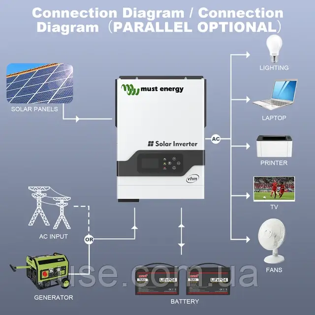 Гібридний інвертор Must 3 кW 24 V — це багатофункціональний інвертор/зарядний пристрій, що одночасно поєднує в собі функції інвертора, зарядного пристрою для акумулятора та сонячного зарядного пристрою MPPT.