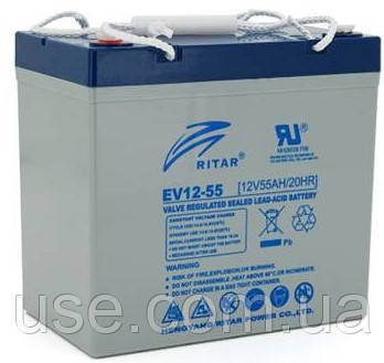 Акумулятор моделі RITAR EV12-55 – це AGM свинцево-кислотний тип, що забезпечує надійну роботу у різноманітних умовах. Його номінальна ємність становить 55 Аh, що забезпечує тривалу підтримку обладнання. При 12V напрузі гарантує стабільну енергію.